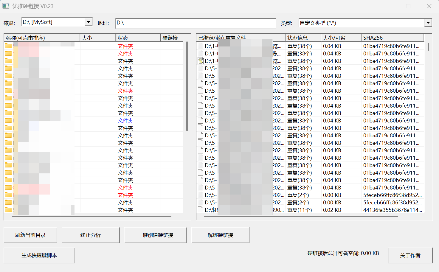 使用很简单,只要选择查找的盘符,比如我想找D盘下的重复文件,则选择D盘,再选择类型,类型如果不选就是查找D盘下的所有文件,等软件分析完成后,再点【一键创建硬链接】即可。