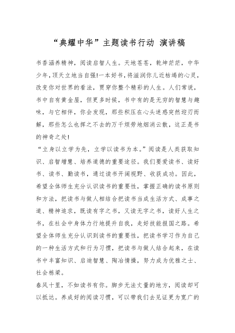 首页热门资源演讲讲话“典耀中华”主题读书行动 演讲稿