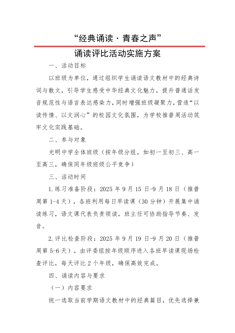“经典诵读・青春之声”——诵读比赛实施方案(中学)