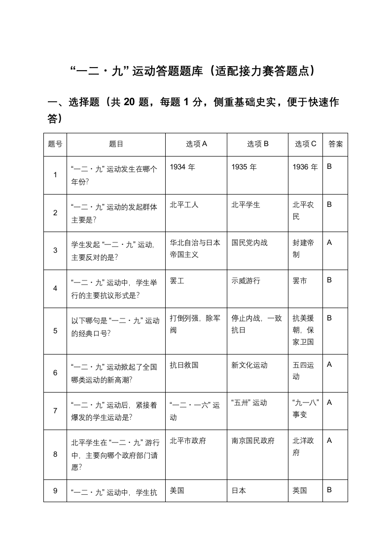 “一二・九” 运动答题题库