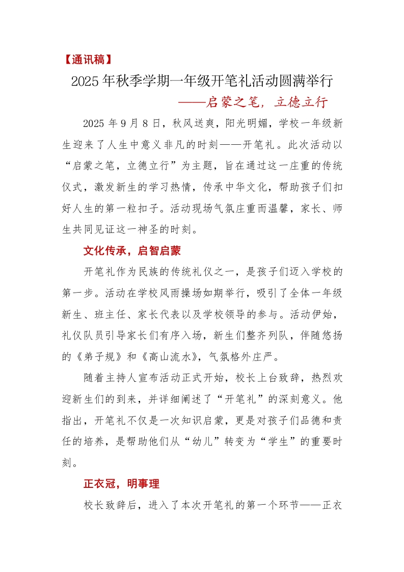 【通讯稿】2025-2026年秋季学期一年级开笔礼活动圆满举行:启蒙之笔,立德立行