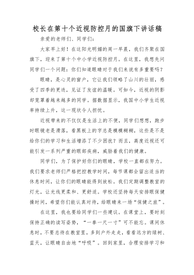 2.校长在第十个近视防控月的国旗下讲话稿