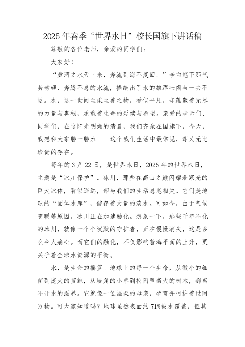 4.2025年春季世界水日校长国旗下讲话稿