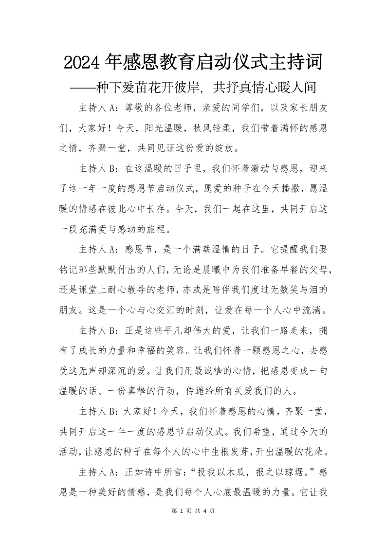 2024年感恩教育启动仪式主持词