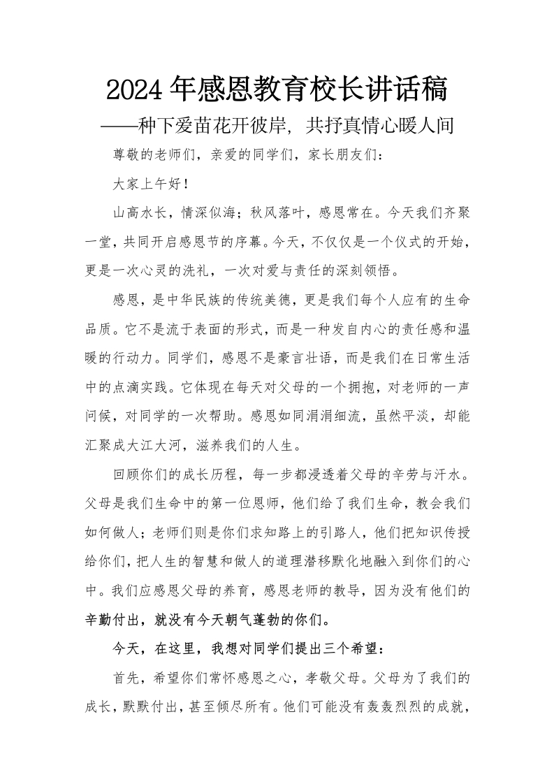 2024年感恩教育校长讲话稿