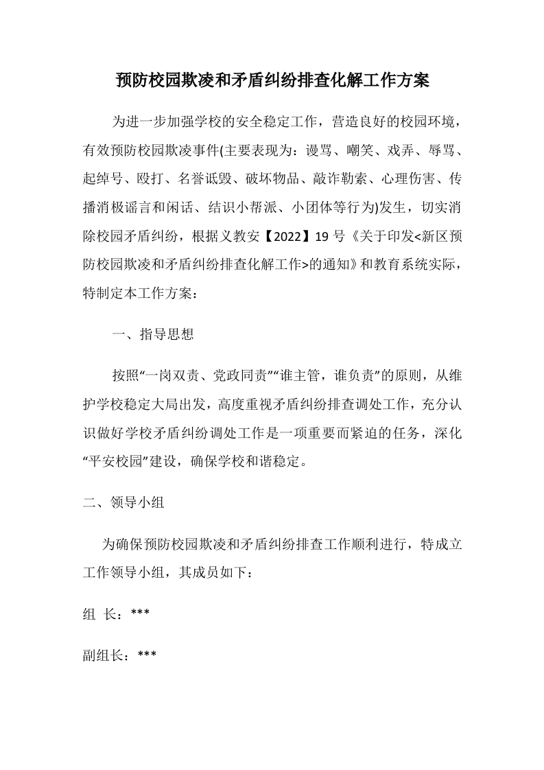预防校园欺凌和矛盾纠纷排查化解工作方案
