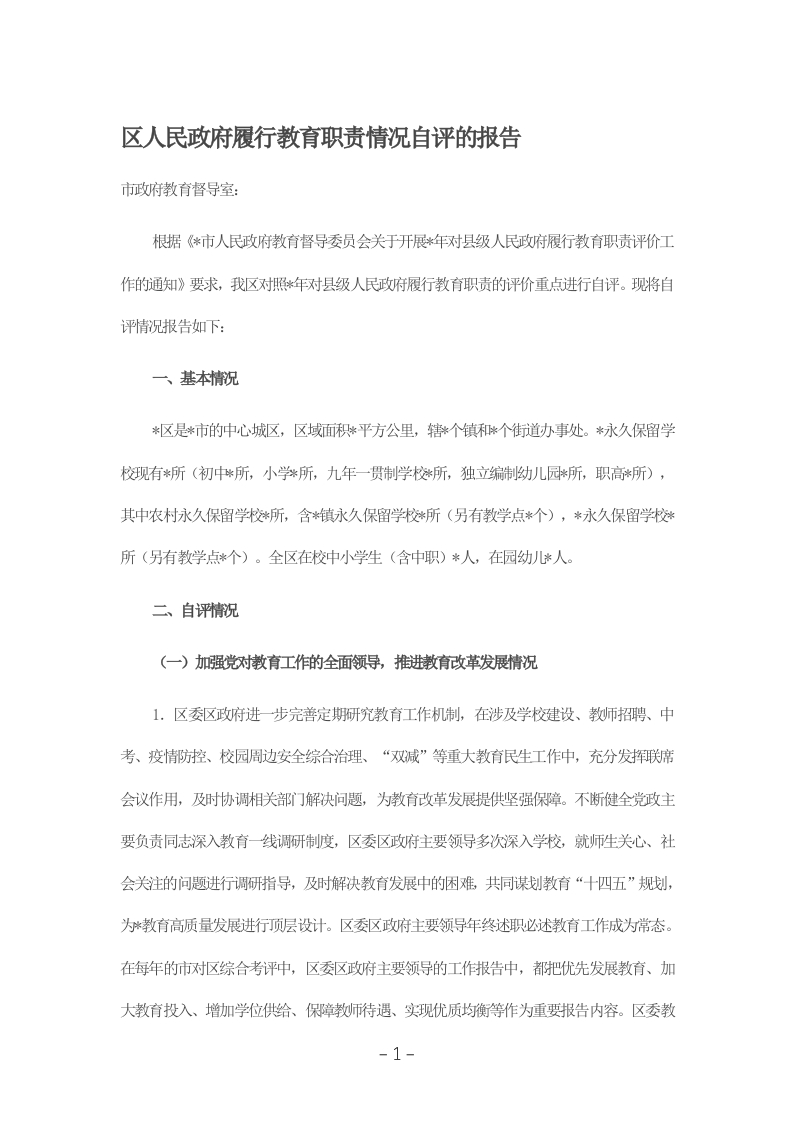区人民政府履行教育职责情况自评的报告