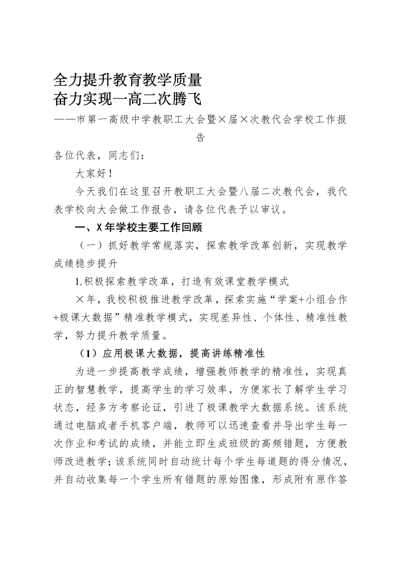 全力提升教育教学质量奋力实现一高二次腾飞市第一高级中学教职工大会暨×届×次教代会学校工作报告