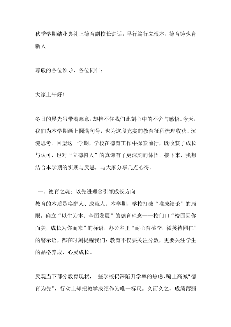 秋季学期结业典礼上德育副校长讲话:早行笃行立根本,德育铸魂育新人