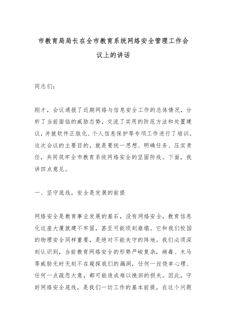 市教育局局长在全市教育系统网络安全管理工作会议上的讲话