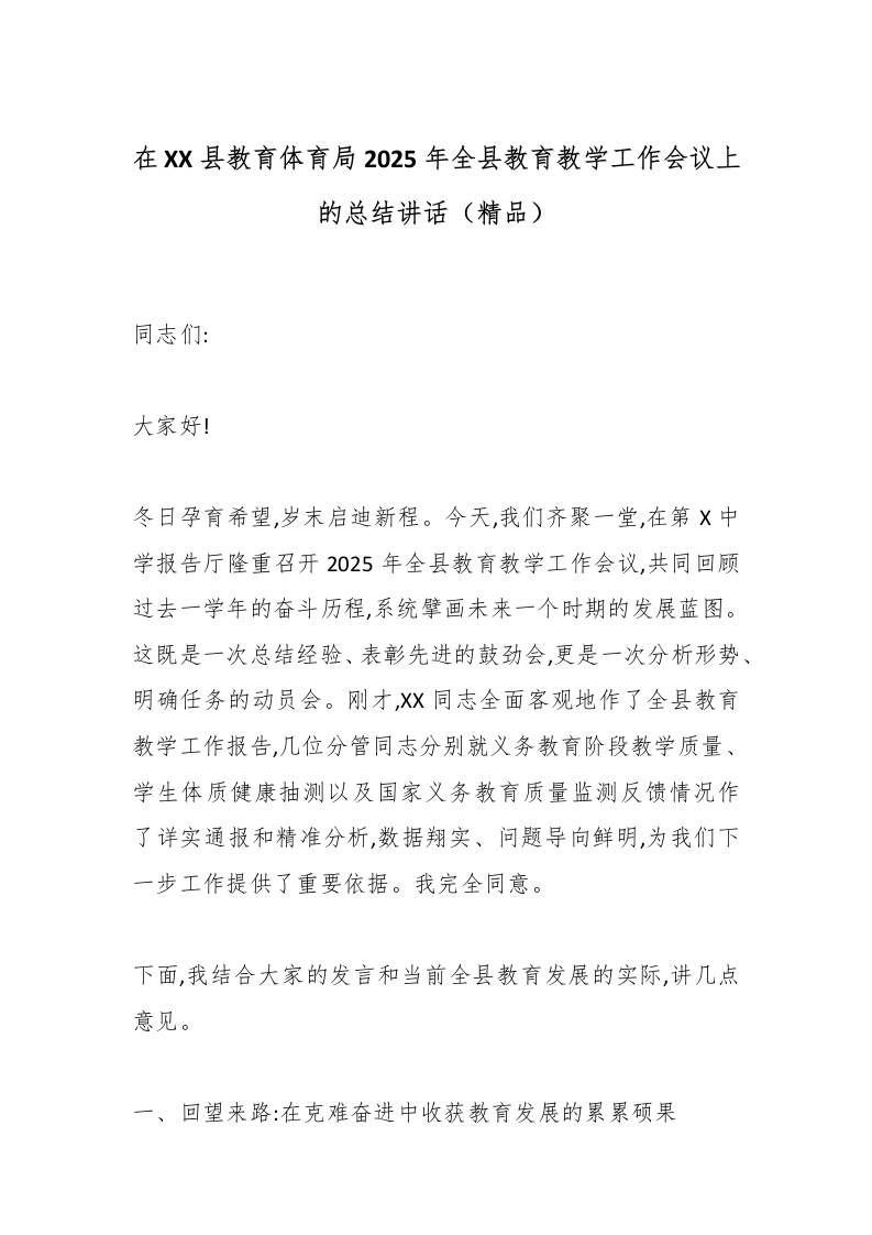 在XX县教育体育局2025年全县教育教学工作会议上的总结讲话(精品)
