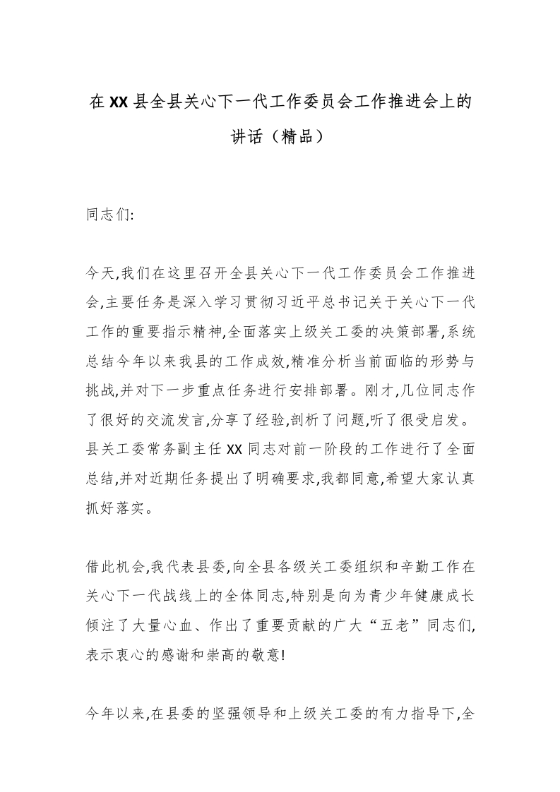 首页党建资料讲稿讲话在XX县全县关心下一代工作委员会工作推进会上的讲话(精品)