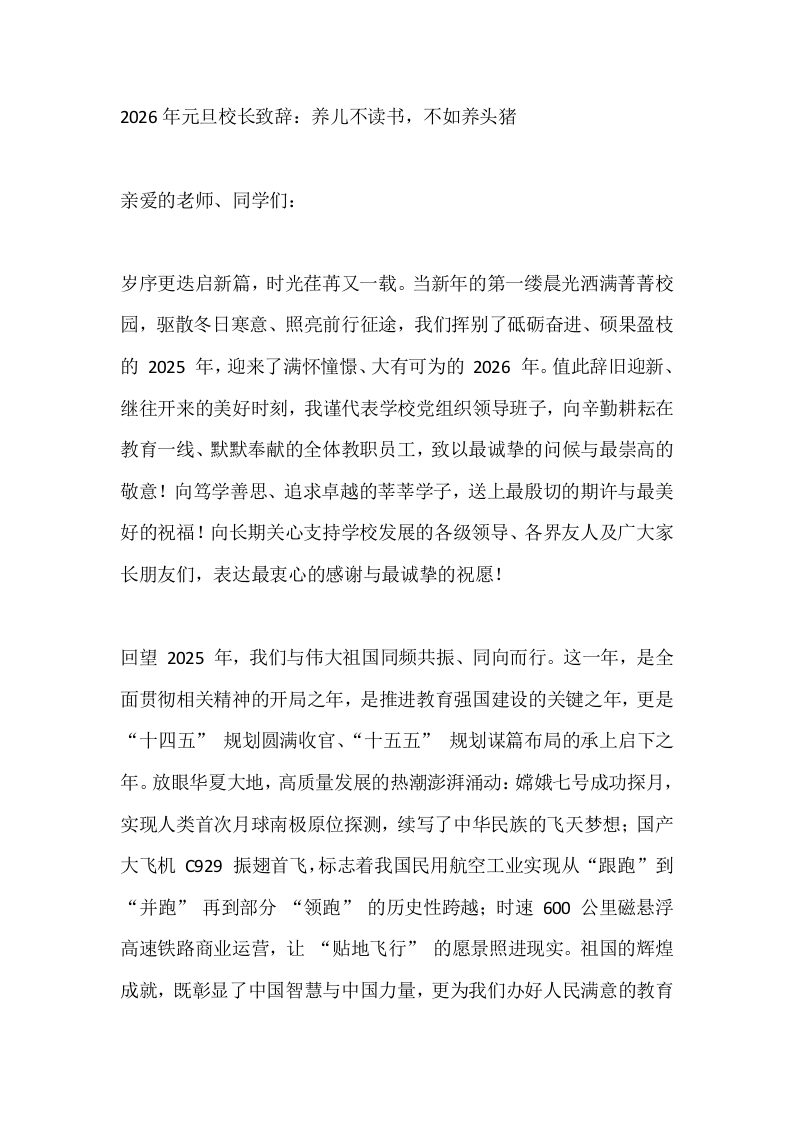 2026年元旦校长致辞:养儿不读书,不如养头猪