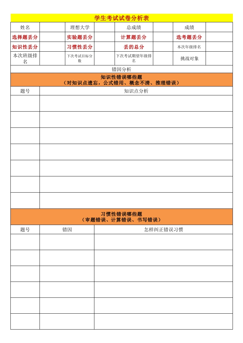 首页班主任库常用表格学生考试试卷分析表